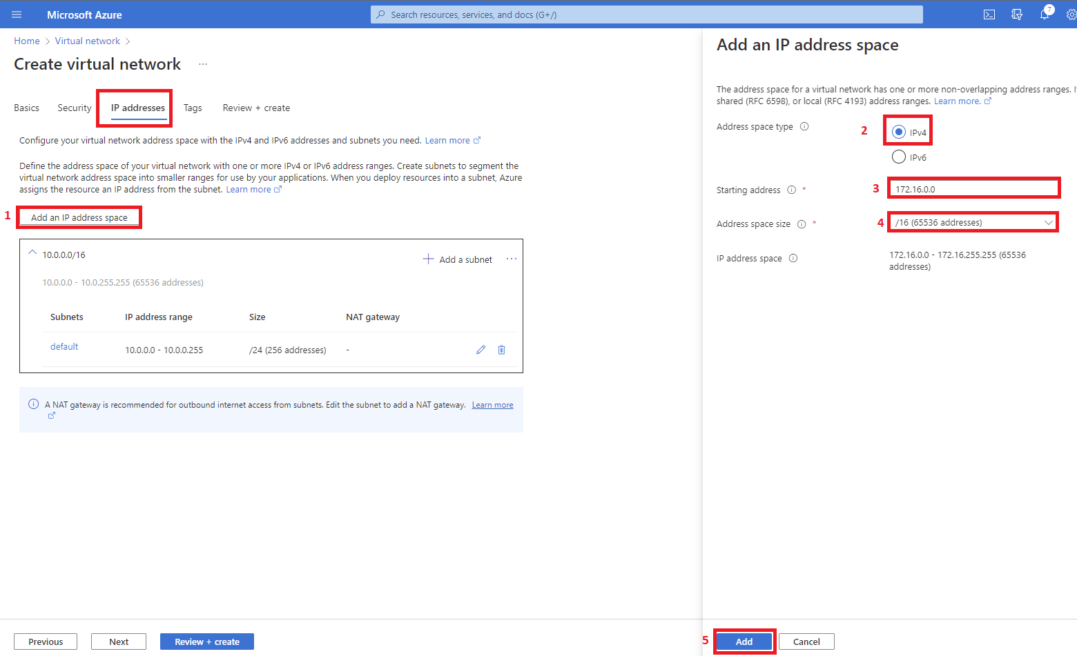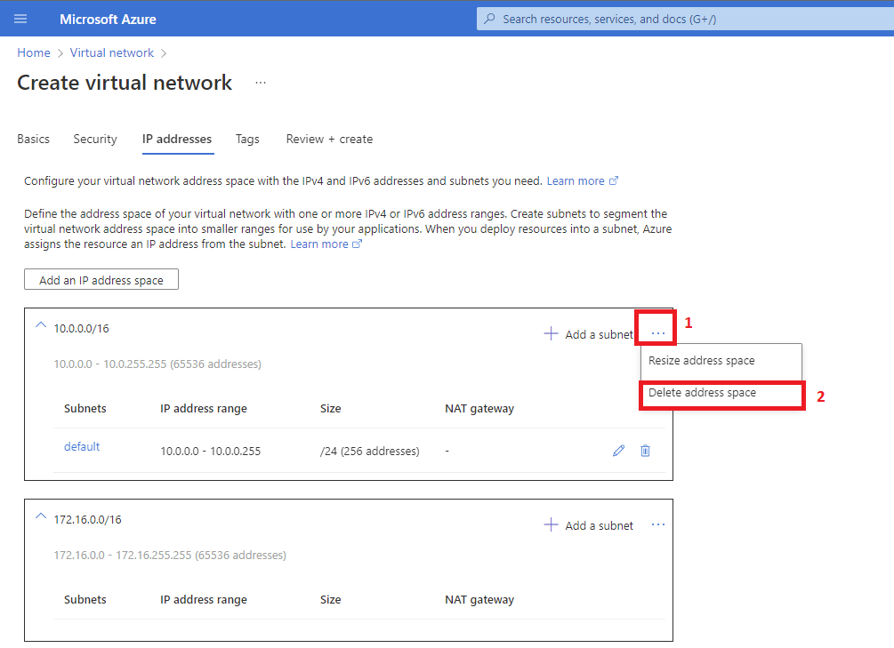 Step 9: On the IP addresses tab click on the Add an IP address space and select the Address space type radio button for IPv4. Starting address type 172.16.0.0, Address space size use the drop-down to select /16 (65536 addresses) and click the Add button.