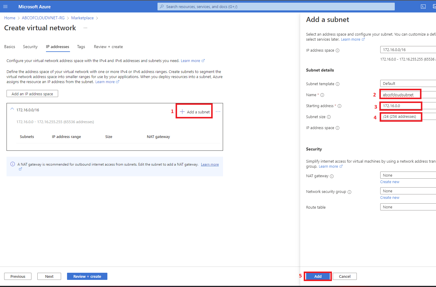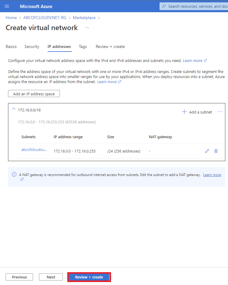 We will be using the 172.16.0.0/16 for our address space and for the subnet we will create two subnets: abcofcloudsubnet with a subnet address space of 172.16.0.0/24.