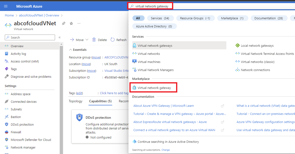 Step 1: Search for Virtual network gateway in Azure portal.