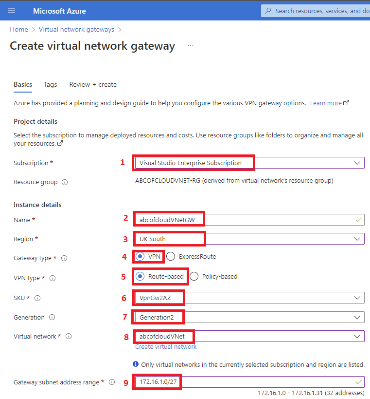 Step 12: We will change the default Gateway subnet address range to 172.16.1.0/27 or larger which is (/26,/25,/24, etc.) Anything lesser will throw an error if you’re trying to deploy a zone-redundant/zonal gateway and also this allows enough IP addresses for future changes.