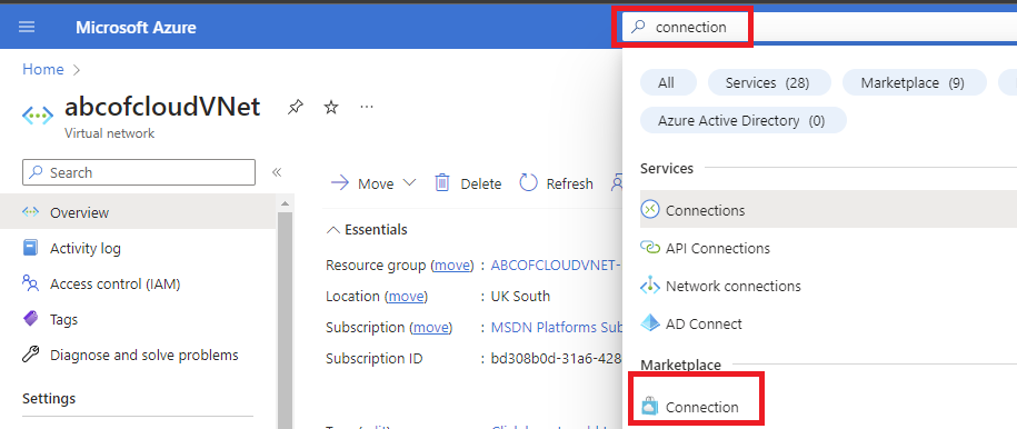 Step 1: Log in to Azure portal and type connection in the search bar.