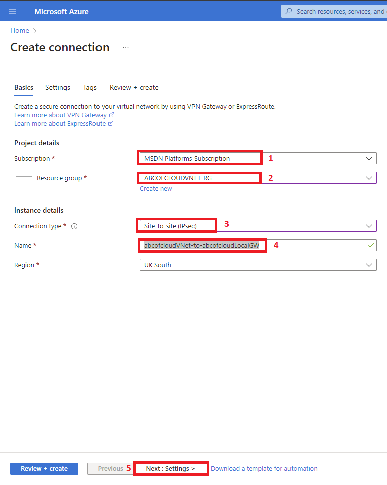 Step 5: Enter a preferred name, for this tutorial I will be using “abcofcloudVNet-to-abcofcloudLocalGW”.